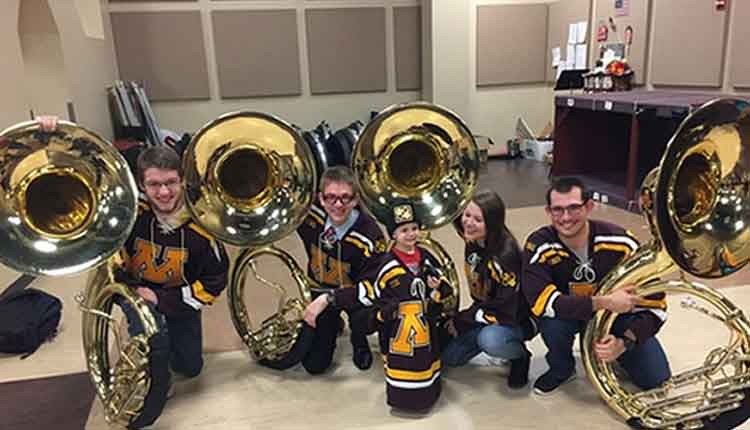 You enter the orchestra room and notice your friend as well as a very small group of other people with what looks to be tubas wrapped around them